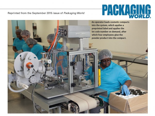 In questo articolo pubblicato sul numero di Settembre 2015 di PACKAGING WORLD, una delle più importante riviste Americana del settore , viene illustrata una soluzione realizzata con una LABELX 140 TPN con integrata una unità di codifica a getto d’inchiostro, studiata per l’applicazione di etichette sul fondo di confezioni per prodotti di make-up