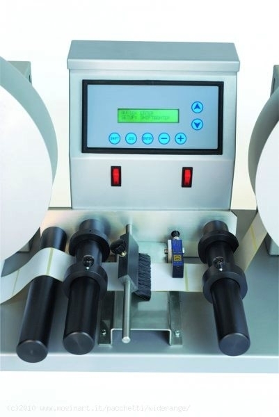 La scheda di controllo a microprocessore permette inoltre di impostare il contapezzi, la velocità di ribobinamento, arrestare la rotazione del motore a bobina ultimata o in caso di rottura carta, arrestare o meno il ribobinamento in caso di mancanza etichette.