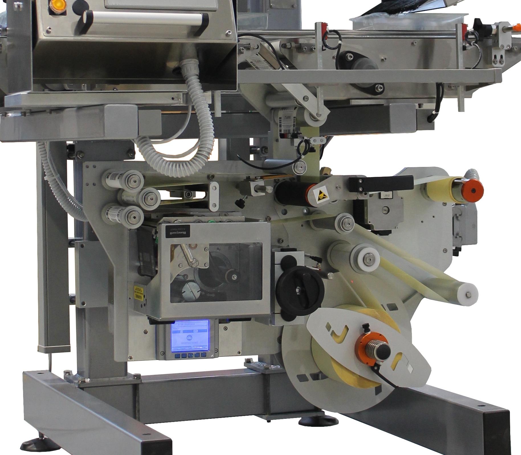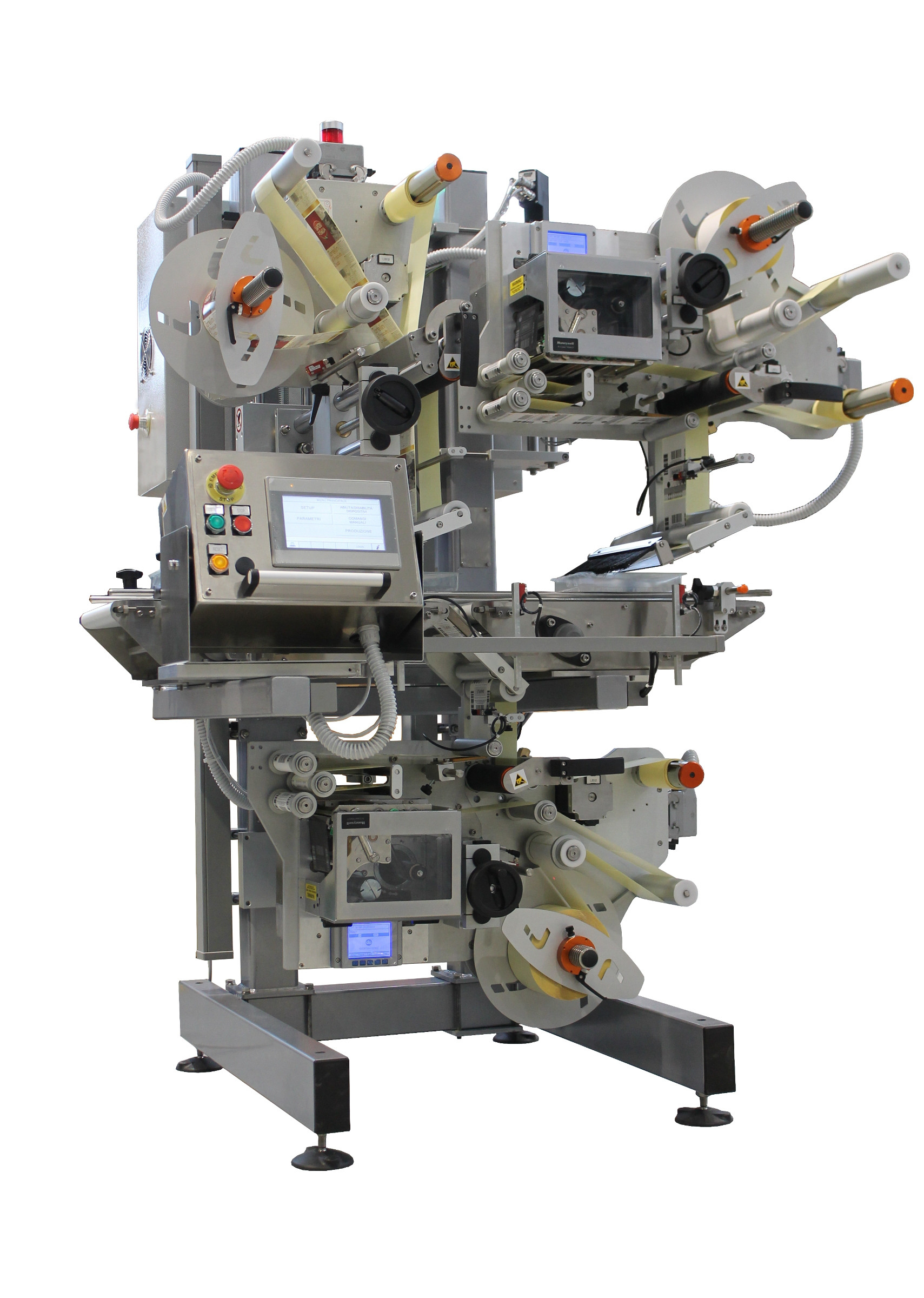 Sistema di etichettatura per applicazione di etichette multiple su vaschette alimentari con stampa di dati variabili in linea.