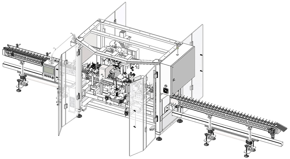 Nella prima stazione è previsto un sistema di rotazione con controllo a telecamere con ricostruzione dell’immagine per determinare la corretta posizione di applicazione dell’etichetta barcode. Una successiva telecamera controlla la presenza dell’etichetta e la corretta posizione. Nel sistema di trasporto del prodotto è inserito anche un marcatore Laser per la codifica del lotto di produzione.
